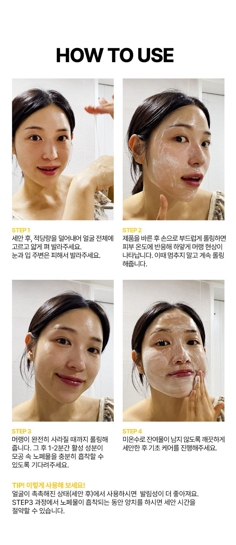 - Continue rolling until the meringue disappears. Wait 1–2 minutes for active ingredients to absorb waste from the pores.