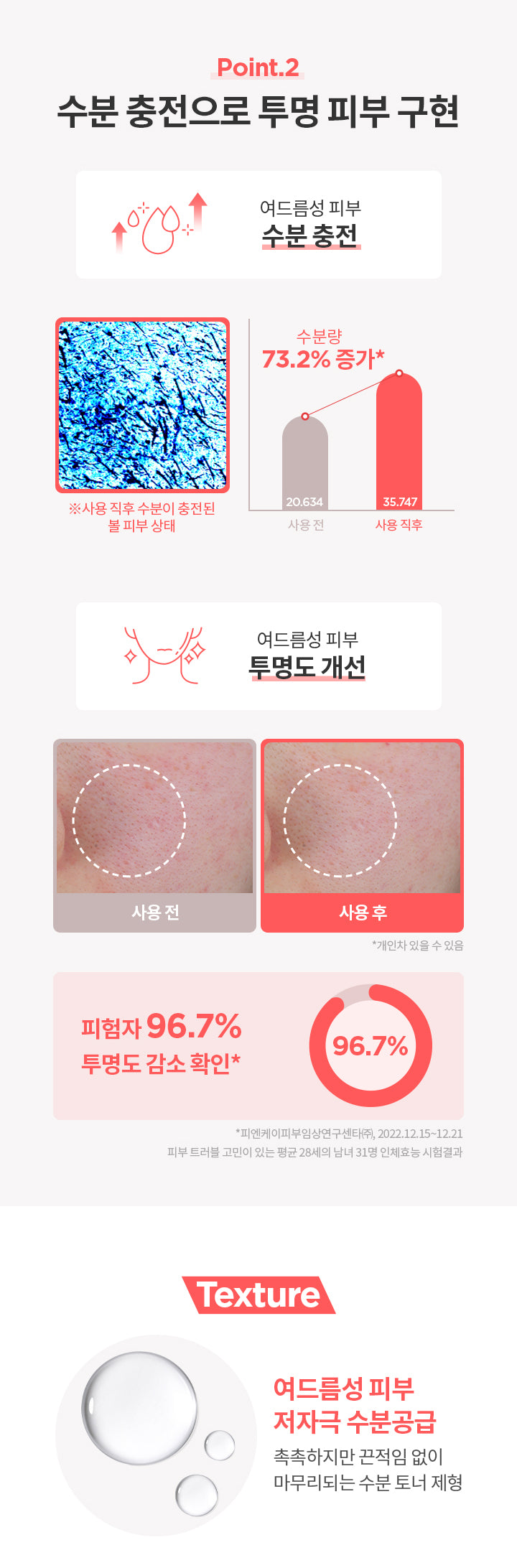 - Point 2: Enhances skin transparency and moisture, with 96.7% of subjects confirming improved skin clarity.