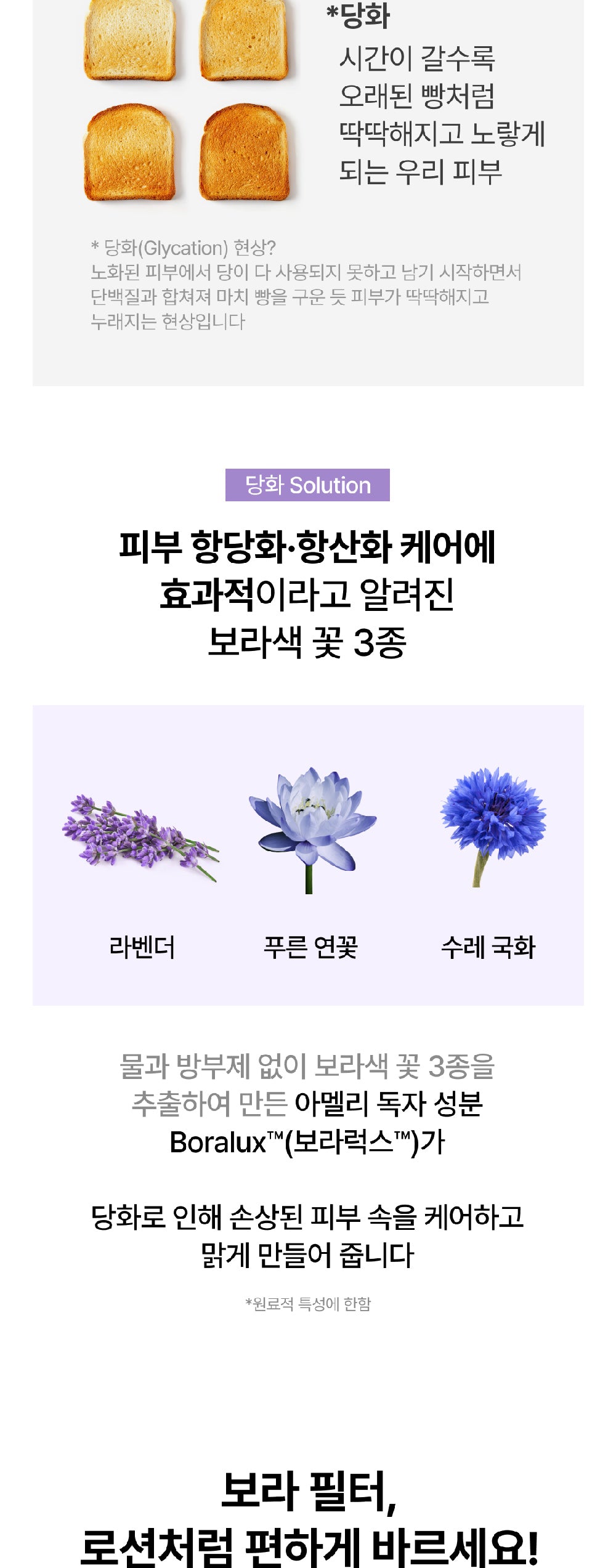 Glycation, a process in aged skin where sugars bind to proteins, can lead to skin that feels stiff and lacks elasticity. Amelie combats this with Boralux™, a powerful extract derived from three purple flowers:
