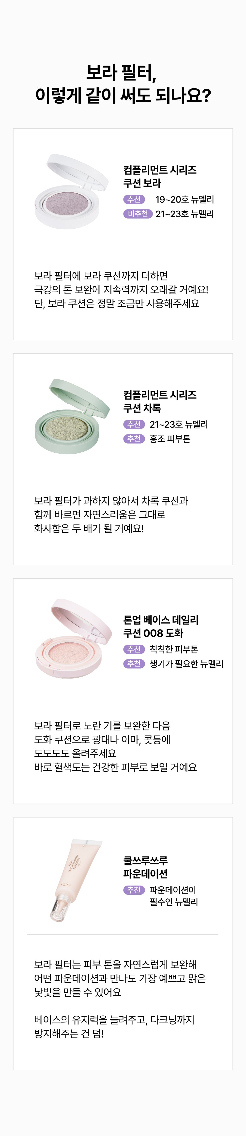 - Bora Cushion No. 19-20: Ideal for long-lasting correction of yellowish skin tones. However, use only a small amount of purple cushion.