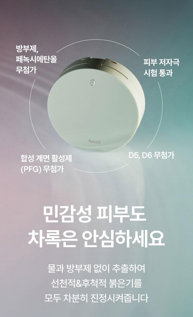 The cushion is extracted without water and preservatives, ensuring it soothes both innate and acquired redness, while also neutralizing dullness and yellowish undertones for a calm and clean finish.