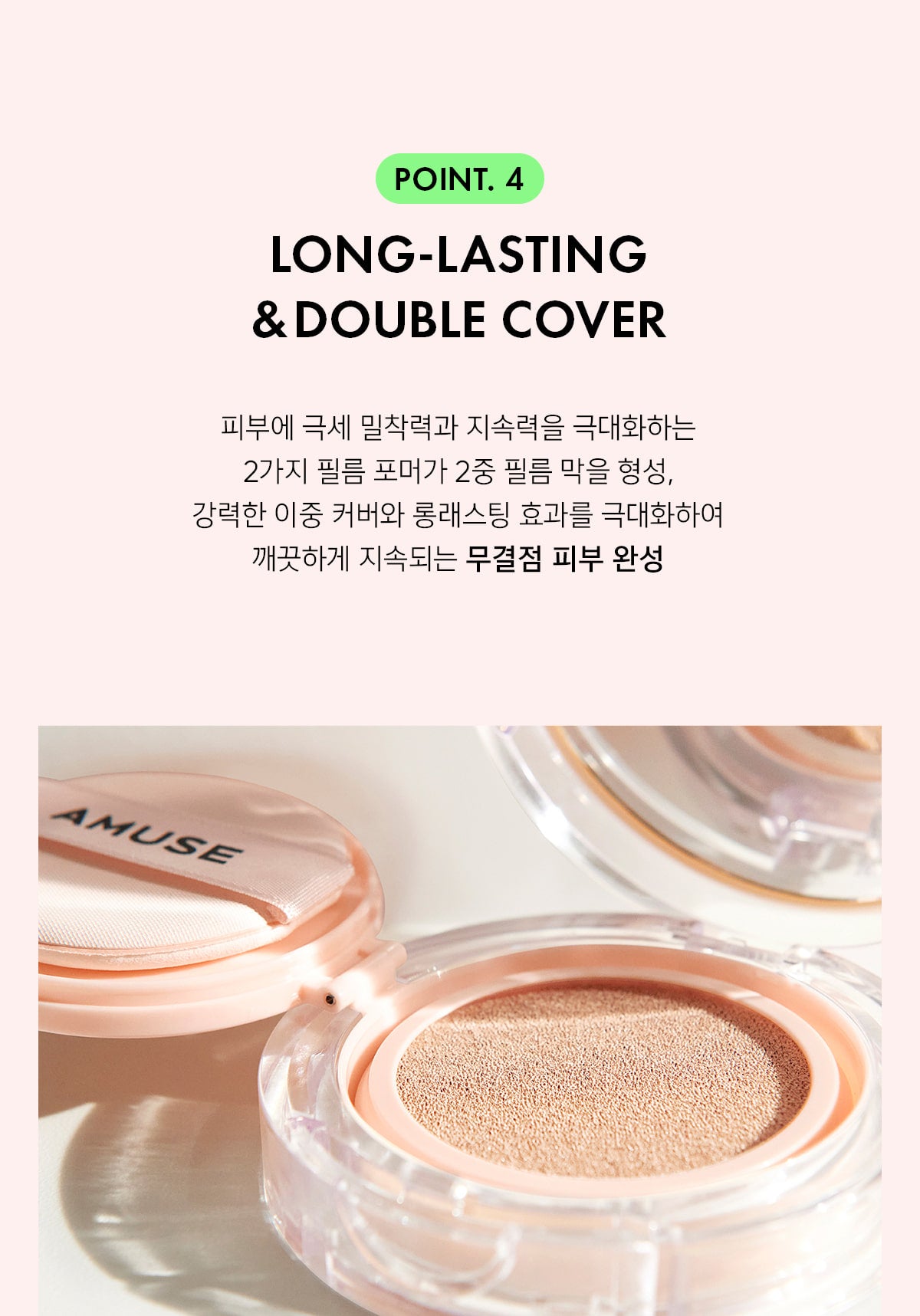 Two film formers that maximize ultra-fine adhesion and durability to the skin form a double film film, maximizing powerful double coverage and long-lasting effects to create clean, flawless skin that lasts.