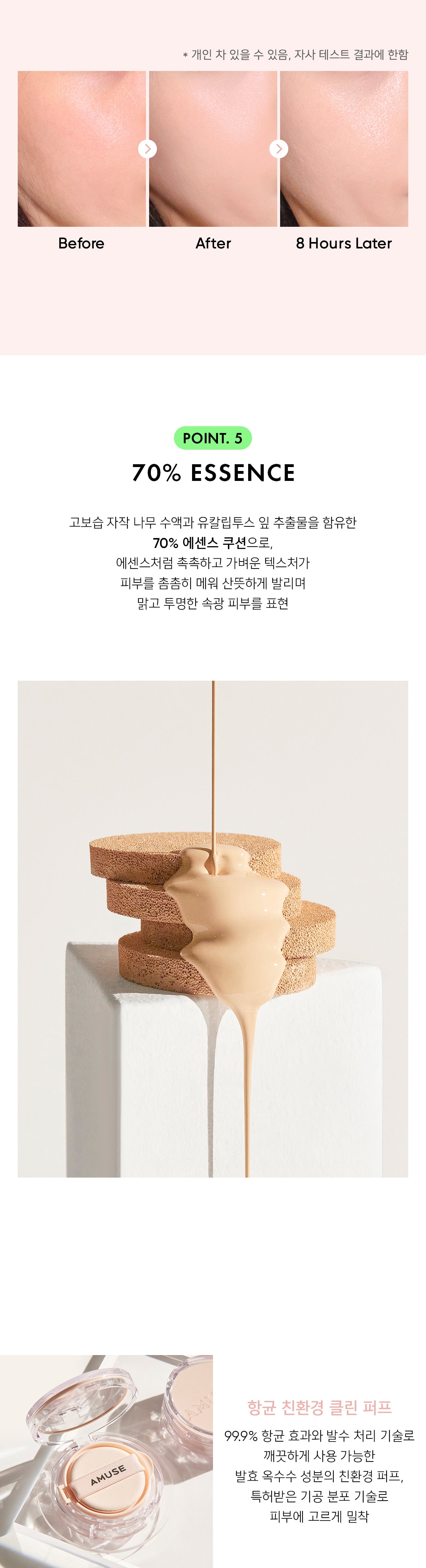 This 70% essence cushion contains highly moisturizing birch sap and eucalyptus leaf extract. The moist, light texture like essence fills the skin tightly and applies refreshingly, creating clear, translucent skin.