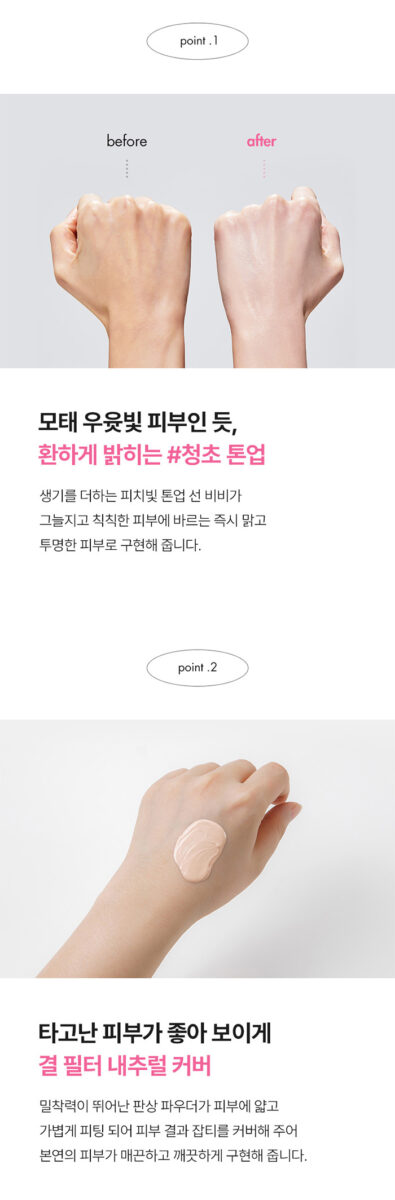 Our Peachy Tone-Up Sun BB is specially formulated to revive and illuminate tired, dull skin, giving it a vital, bright, and clear appearance. It’s perfect for those looking to enhance their skin’s natural beauty without the heaviness of traditional makeup. The high fitting powder technology ensures a light, seamless adherence to the skin, effectively concealing blemishes and achieving a smooth, flawless complexion that looks just like your original skin.