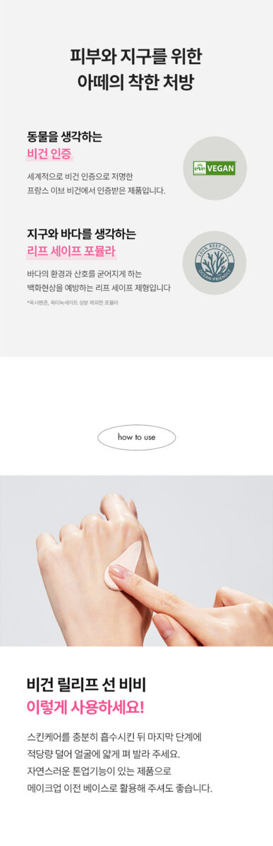 We take pride in our commitment to ethical beauty standards and environmental responsibility. The Athe Vegan Relief Tone Up Sun BB is certified by the globally recognized French EVE Vegan organization, ensuring it meets strict vegan criteria. Additionally, our reef-safe formula is designed to prevent coral bleaching, making it a conscientious choice for eco-aware consumers.