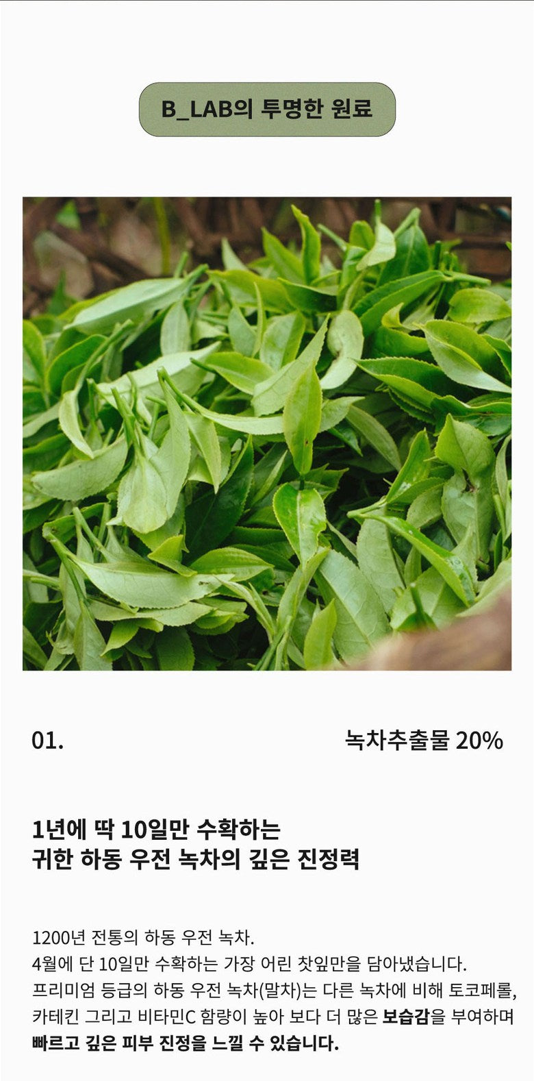 - 20% Hanong Green Tea Extract: Sourced from the premium Hadong Ujeon green tea, harvested just once a year, this extract is rich in tocopherol, catechin, and vitamin C, offering superior moisture and deep soothing effects.