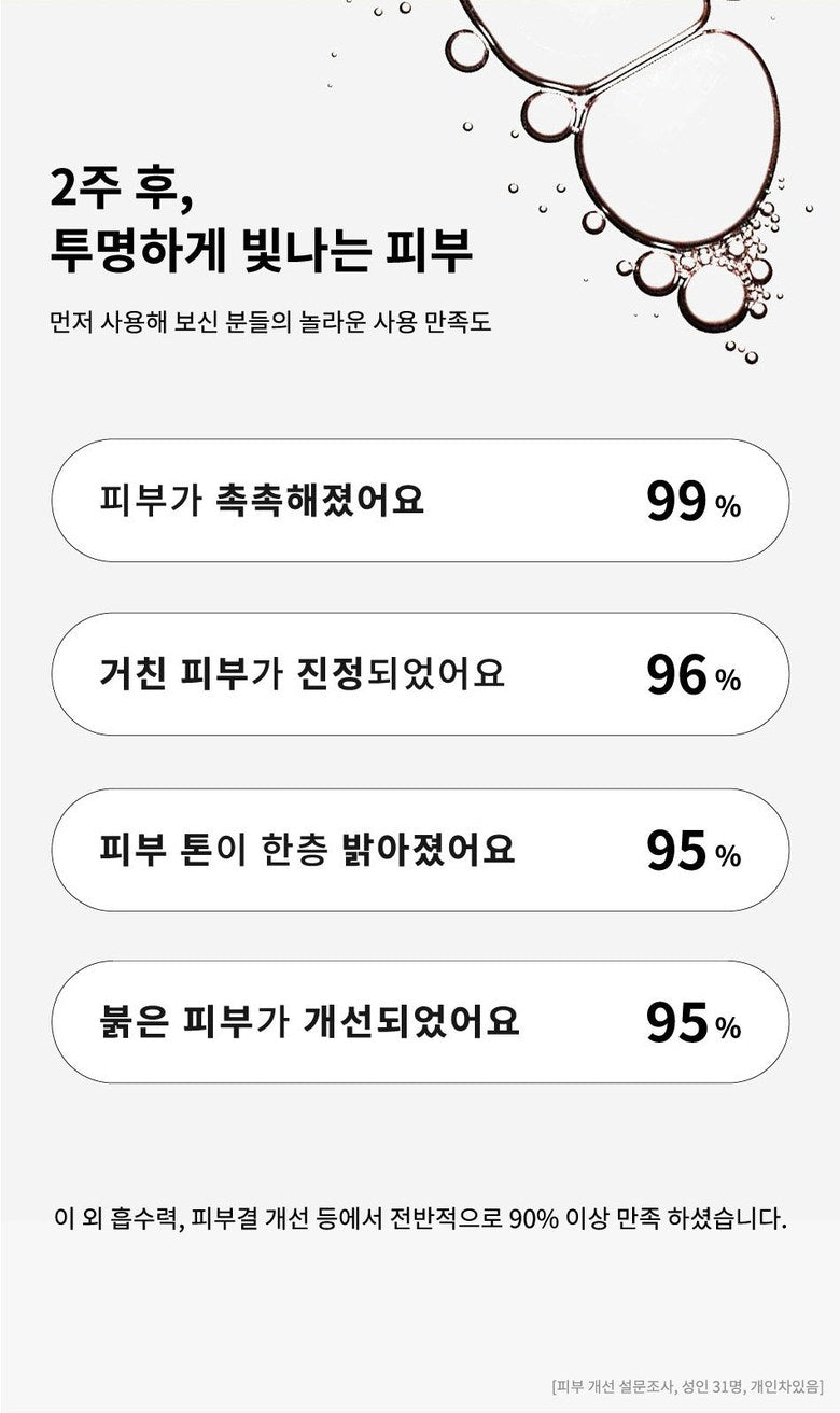 After just 2 weeks of use, expect transparent and glowing skin, with overall satisfaction of over 90%. Witness improved skin tone, reduction in redness, enhanced moisturization, better absorbency, and improved skin texture.