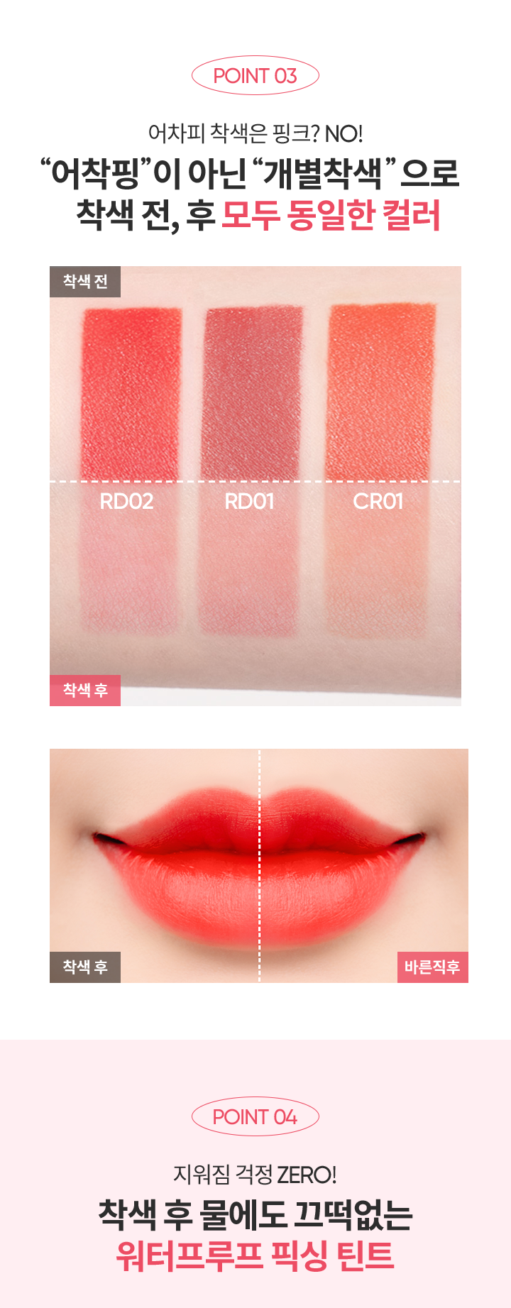 The BANILA CO Color Fixing Tint is truly impressive with its waterproof formula. I’ve worn it during humid summer days, and the color stayed vivid without fading or smudging. The watery satin texture makes application feel light and smooth, allowing for effortless layering to achieve just the right intensity. I appreciate how well it blends into my lips while providing a personalized pigmentation that suits my natural lip color perfectly. This has become my go-to lip product because of its durability and vibrant finish.