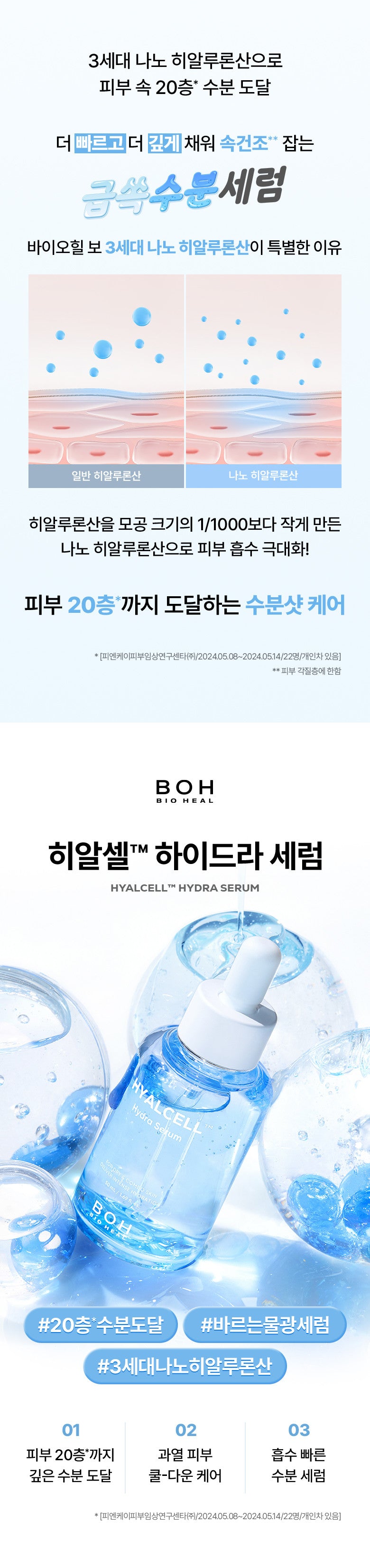 The BIO HEAL BOH HYALCELL™ Hydra Serum utilizes third-generation Nano Hyaluronic Acid to deliver intense hydration 20 layers deep into the skin. Its ultra-fine molecules, 1/1000 the size of a pore, ensure faster and deeper absorption, effectively targeting inner dryness for a well-hydrated, plump complexion.