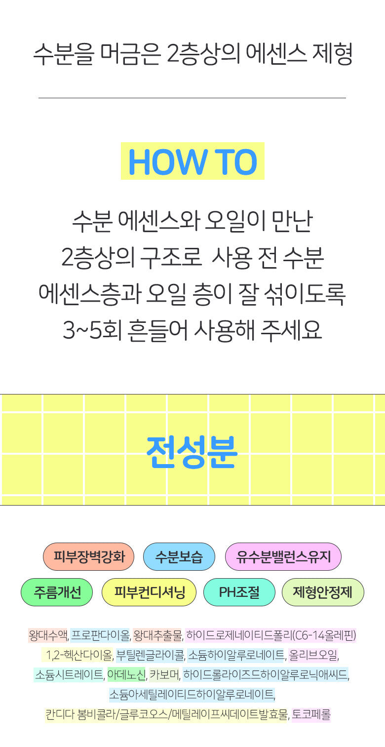 Shake the bottle 3 to 5 times before use to ensure a proper mix of the moisture essence layer and oil layer.