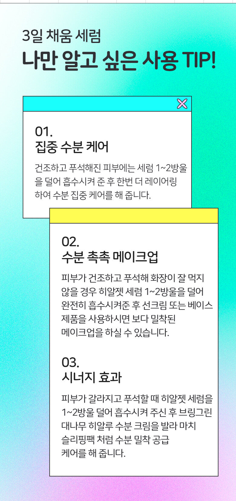 For cracked and rough skin, apply 1-2 drops of Hyaljet Serum, let it absorb, then follow with bamboo hyaluronic acid moisturizing cream. This combination acts like a sleeping pack, providing close and intensive moisture care.