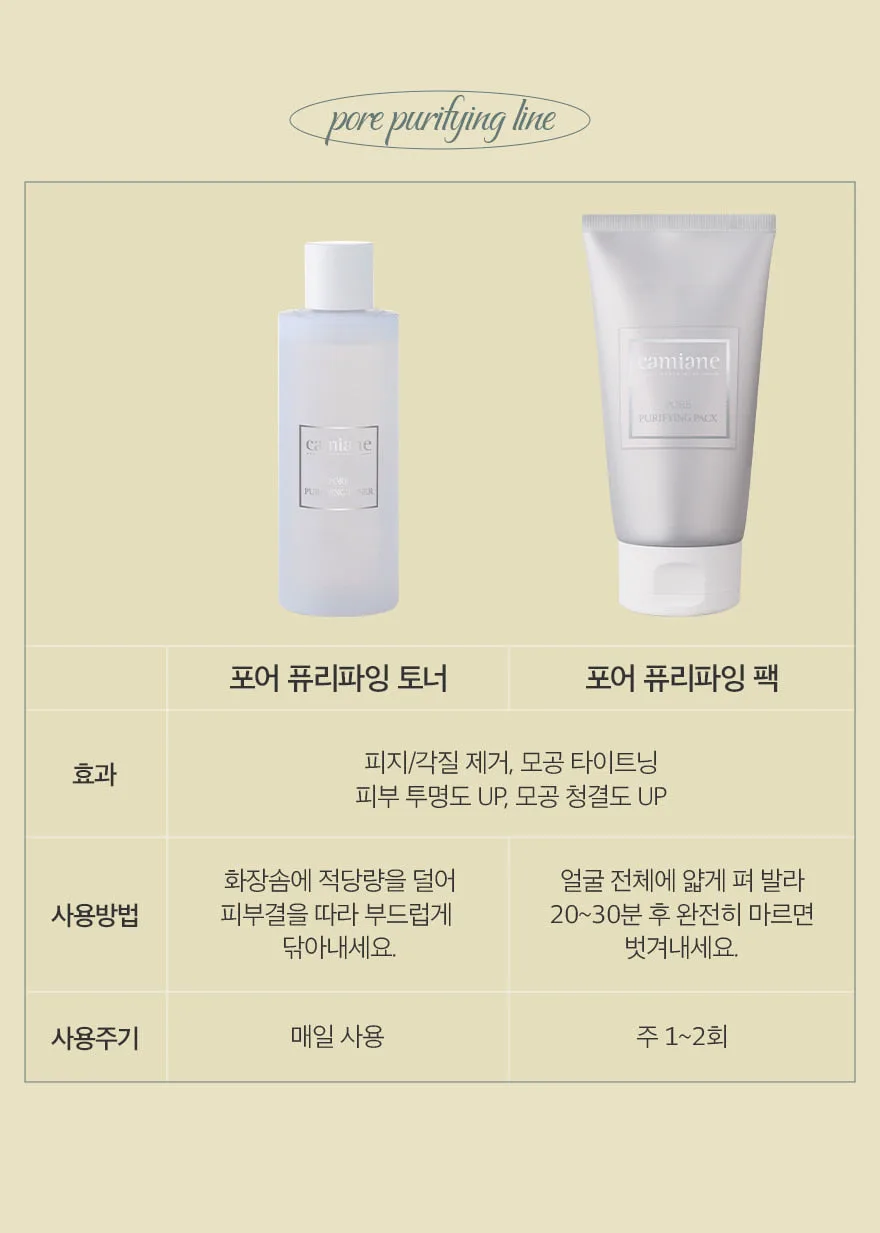 Introducing the ultimate duo for flawless skin: the Pore Purifying Toner and Pore Purifying Pack, a comprehensive solution from spa skin experts designed to tackle the root causes of sagging pores – excessive sebum and the buildup of waste. This powerful combination has been clinically proven to not only refine and cleanse pores but also to improve overall skin texture, ensuring your complexion remains fresh, smooth, and radiant.