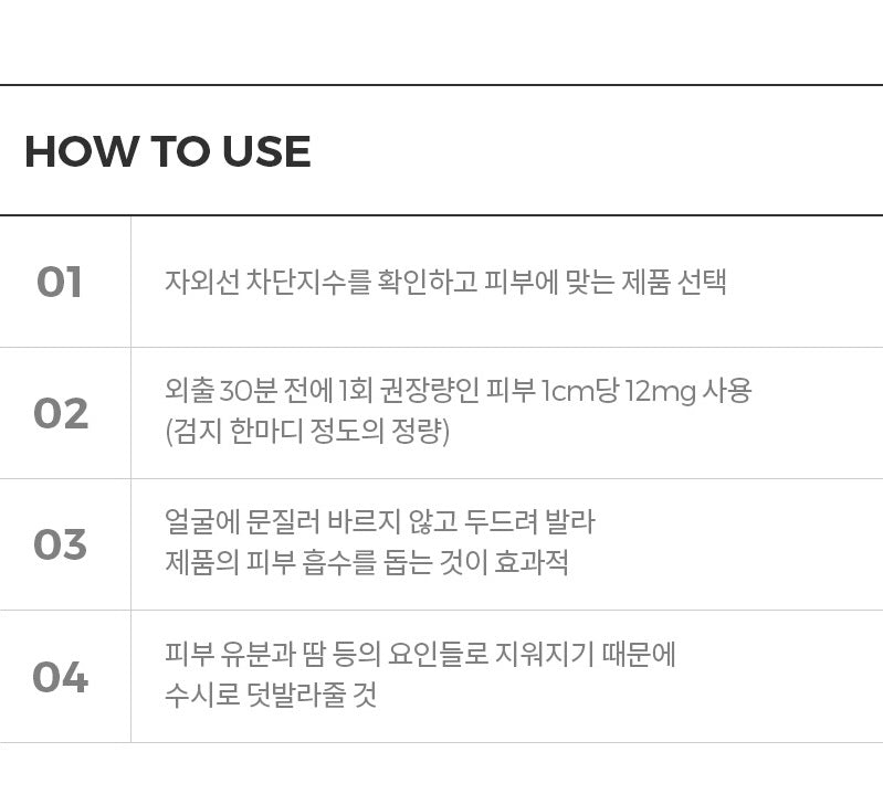 02 Use 12 mg per 1 cm of skin, the recommended amount 30 minutes before going out (quantity about one index finger)