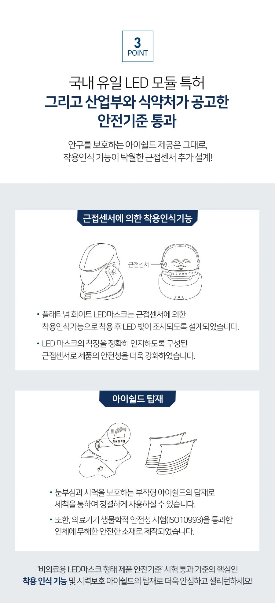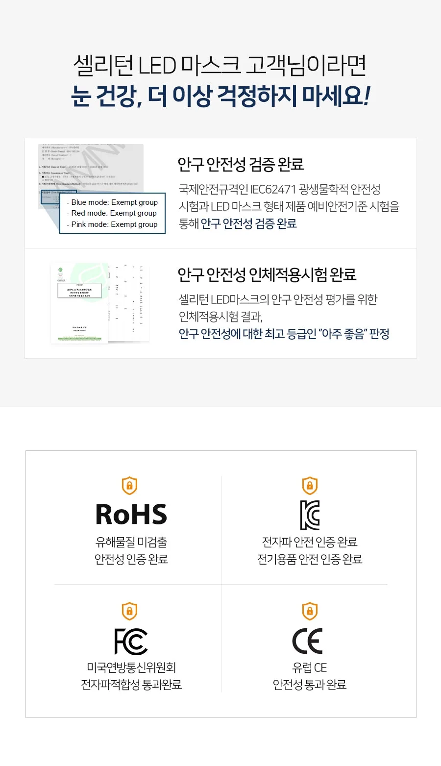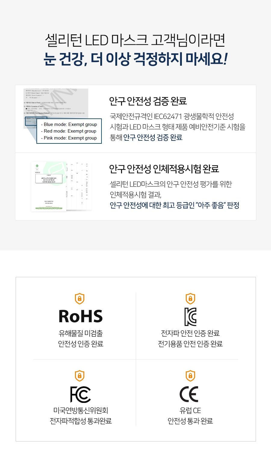 - Successfully passed safety standards set by the Korean Ministry of Trade, Industry and Energy, and the Ministry of Food and Drug Safety.