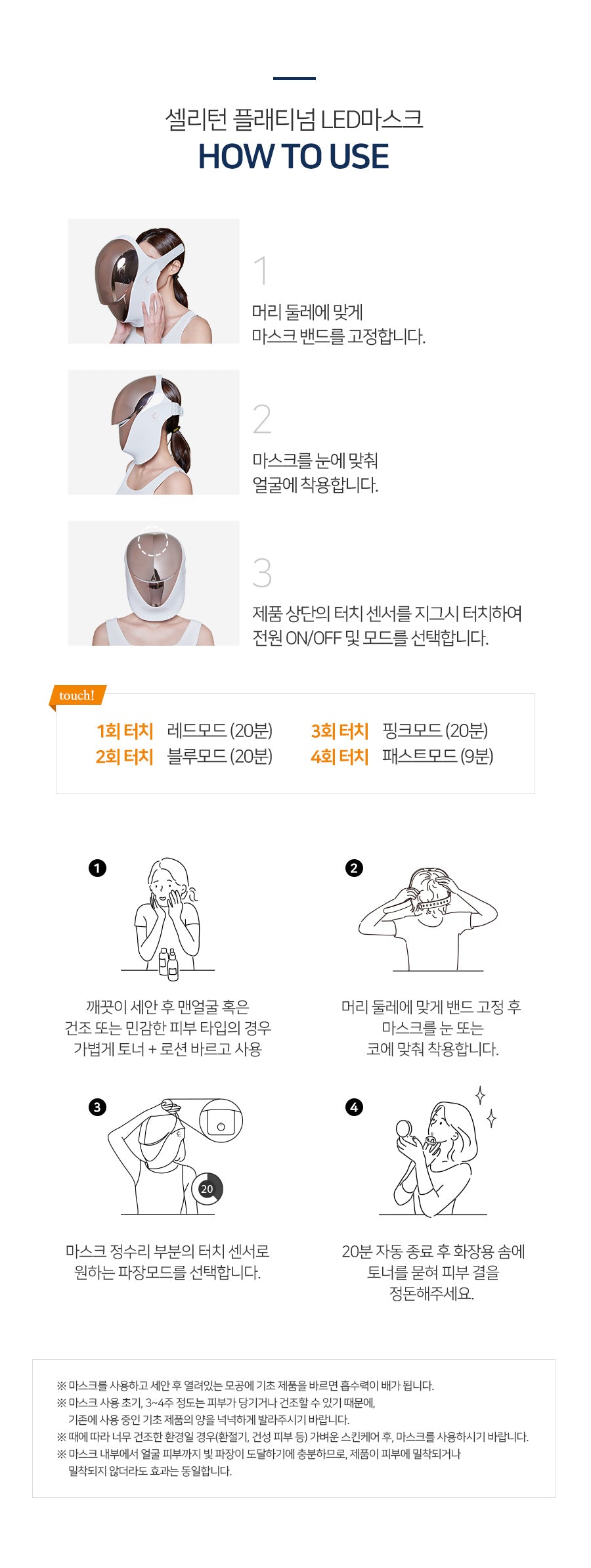 - The mask is recommended for use up to 20 minutes a day, depending on individual skin conditions.