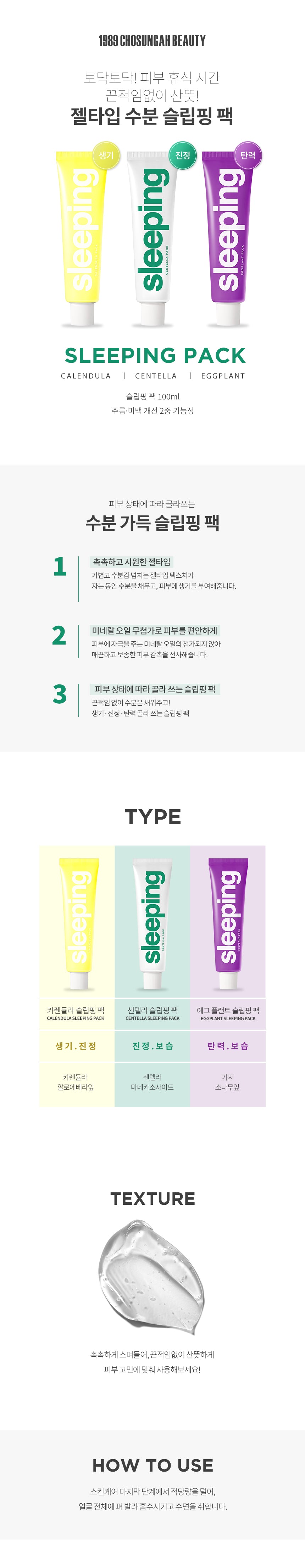 Revitalize your skin overnight with our lightweight, gel-type moisture sleeping packs. These packs are designed to cater to various skin conditions, providing a hydrating and soothing experience without any sticky residue.
