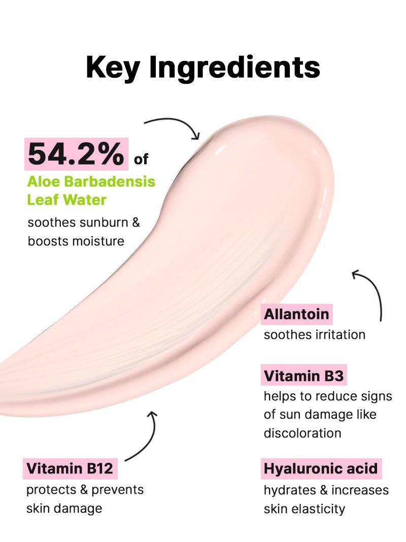 Infused with aloe barbadensis leaf water, the lightweight sunscreen protects against harmful UV rays and soothes sunburn while providing a soft, non-greasy appearance all day.