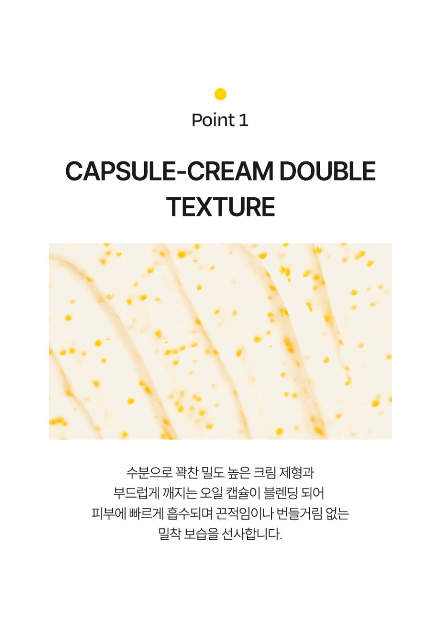 The cream combines a highly dense, moisture-rich cream base with oil capsules for double the hydration. It absorbs quickly into the skin, while the oil capsules create a protective barrier to lock in moisture, ensuring long-lasting hydration.