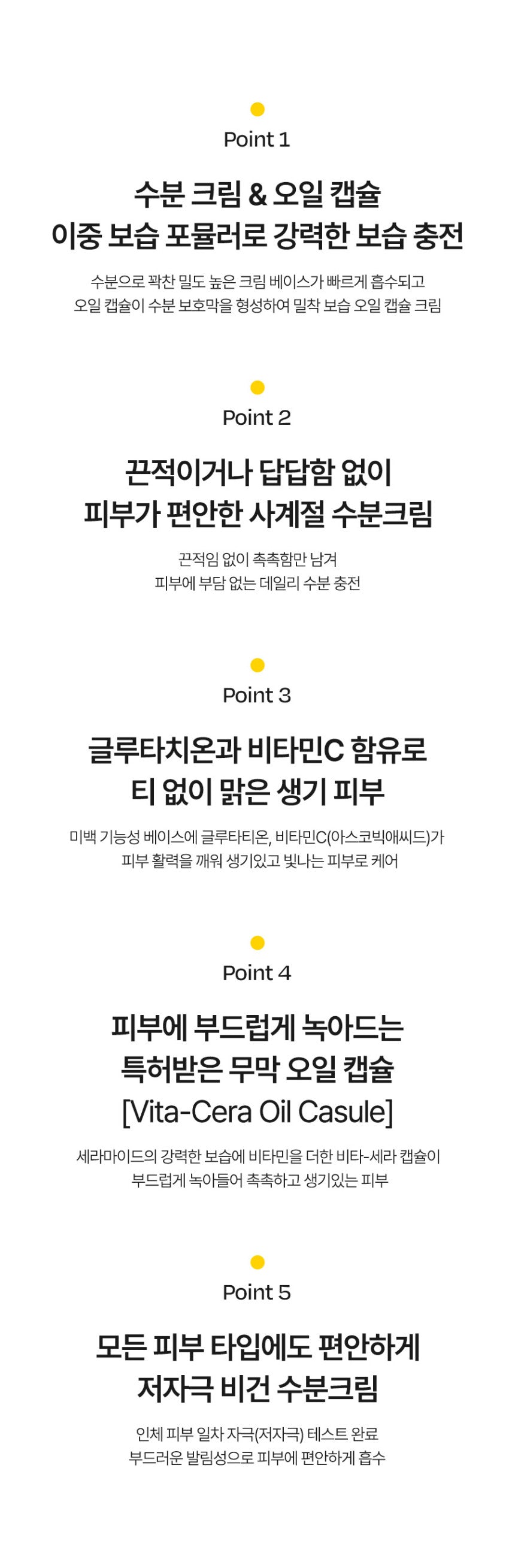 The unique blend of dense cream and delicate oil capsules melts into the skin seamlessly, offering a non-greasy finish that enhances skin glow. Enriched with vitamins encapsulated in the Vita-Cera capsules, it leaves the skin supple and radiant.