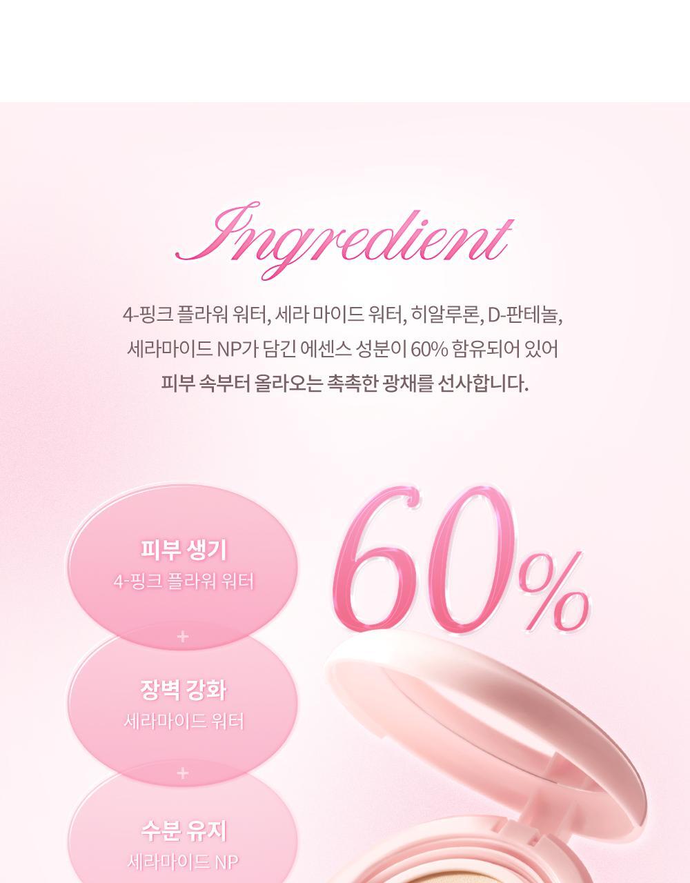 The Clear Radiance Cushion Foundation contains 60% essence ingredients, offering a hydrating glow from within the skin. Key ingredients include: