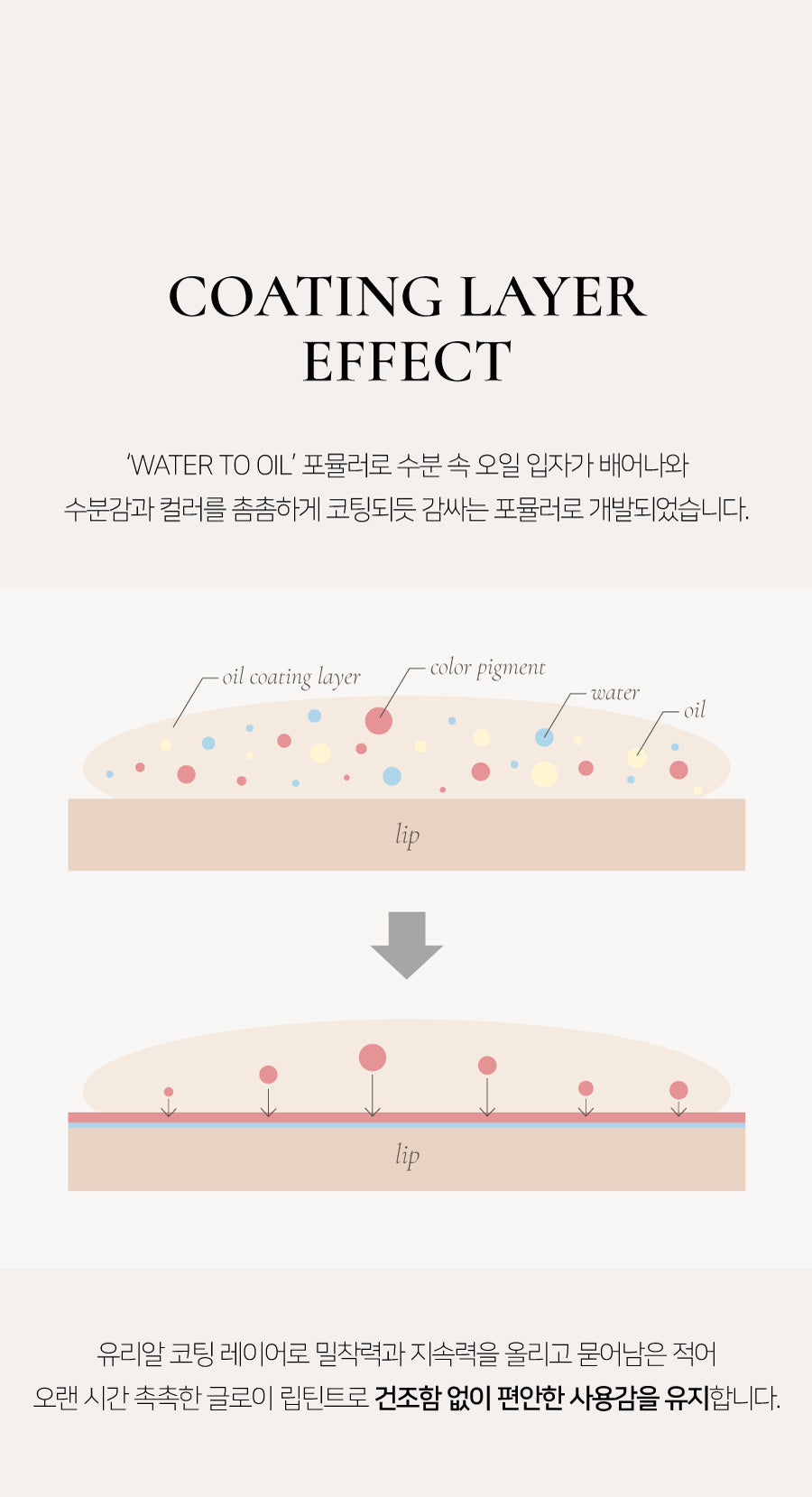 Our innovative Water-to-Oil formula ensures that the oil particles are released from the moisturizing agents, then tightly coated with both moisture and rich color, providing a durable and hydrating wear.