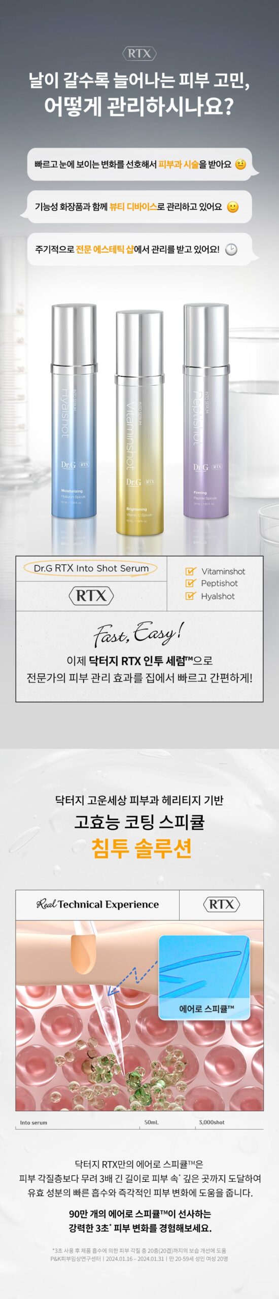 Hey there! So, I recently tried the Dr.G RTX Into Serum Vitaminshot, and wowza, I’m impressed. It’s packed with these crazy cool aero-spicules that apparently dive deeper into your skin than most products out there—like it gets to work in just three seconds! My complexion felt super bright after a few uses. Also, my sensitive skin didn’t flare up at all since it’s refined like fifteen times or something wild like that. Honestly feels luxurious without breaking the bank. Totally worth checking out if you’re into skincare that actually delivers results!