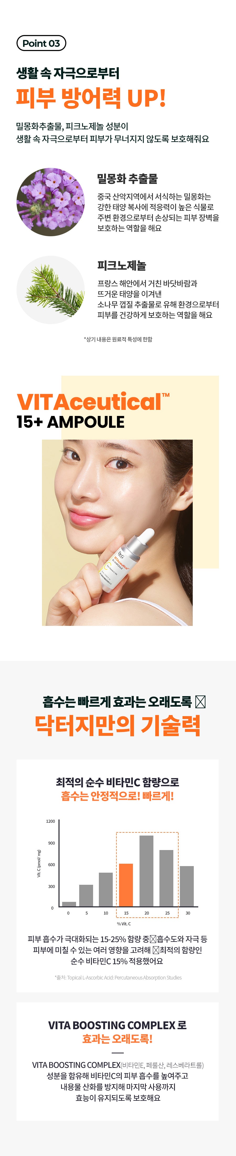 Dr.G VITAceutical 15+ Ampoule is crafted with 15% stabilized pure Vitamin C and enriched with Kakadu Plum Extract to invigorate and refresh your complexion. This formulation ensures efficient absorption of Vitamin C into the skin, maintaining its stability and effectiveness.