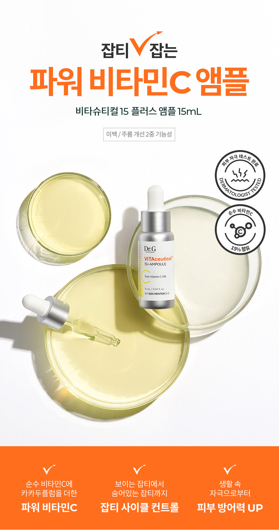 Dr.G VITAceutical 15+ Ampoule is crafted with 15% stabilized pure Vitamin C and enriched with Kakadu Plum Extract to invigorate and refresh your complexion. This formulation ensures efficient absorption of Vitamin C into the skin, maintaining its stability and effectiveness.