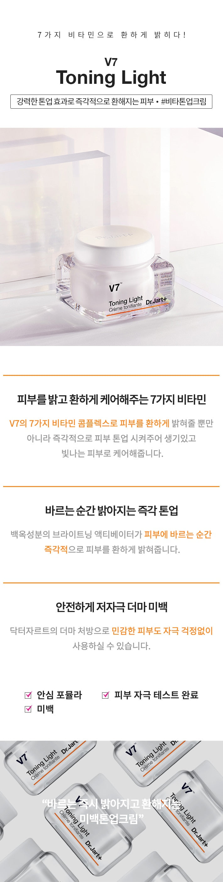 Illuminate and Revitalize Your Skin with V7 Vitamin Complex Dr.Jart+’s V7 Toning Light cream harnesses the power of a 7-vitamin complex to instantly brighten and even out your skin tone, leaving it vibrant and radiant.