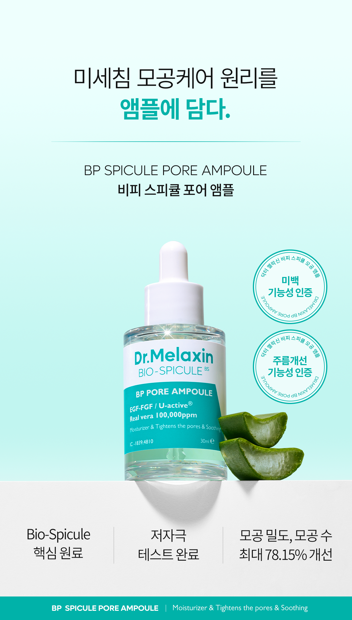 Experience revolutionary pore care with the Dr. Melaxin BIO-SPICULE BP Pore Ampoule, designed to visibly improve pore density and size with just one use.