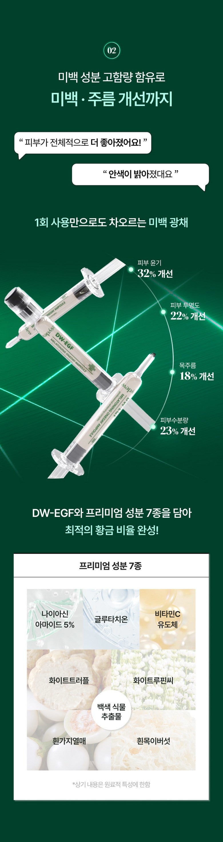The formula combines EGF with MFDS-certified whitening ingredients in an optimal blend to maximize the ampoule’s brightening and freckle-fading benefits.