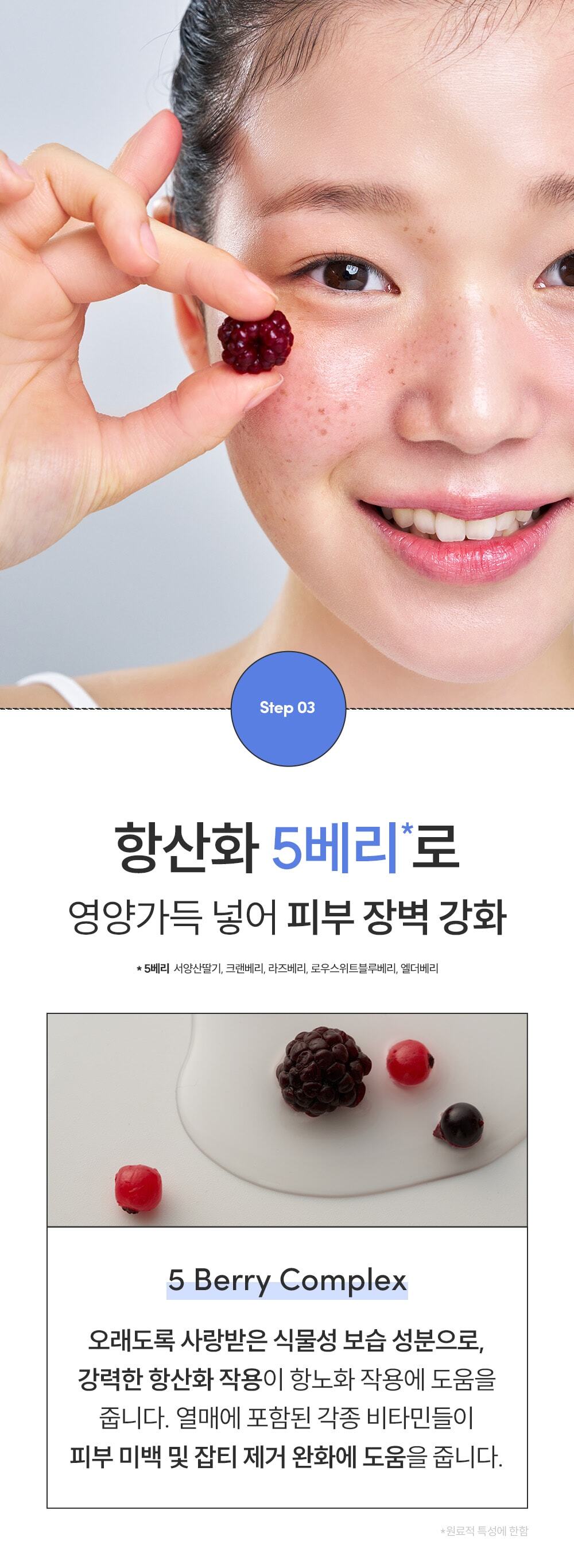 5 Berry Complex: A blend of Western strawberries, cranberries, raspberries, raw sweet blueberries, and elderberries enriches your skin barrier with powerful antioxidants. The vitamins contained within these berries aid in skin whitening and reducing blemishes.