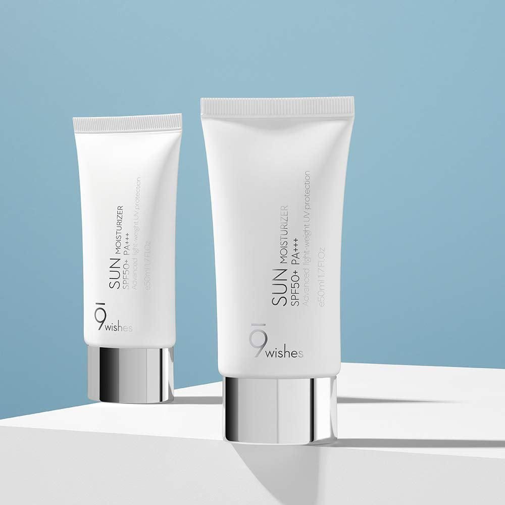 - Sun Defense SPF 50 and Skin Moisturizer : 9 wishes Sun Moisturizer provides highly effective SPF 50 UV protection. Antioxidant-infused sunscreen for men and women that helps protect skin and anti-aging effect.