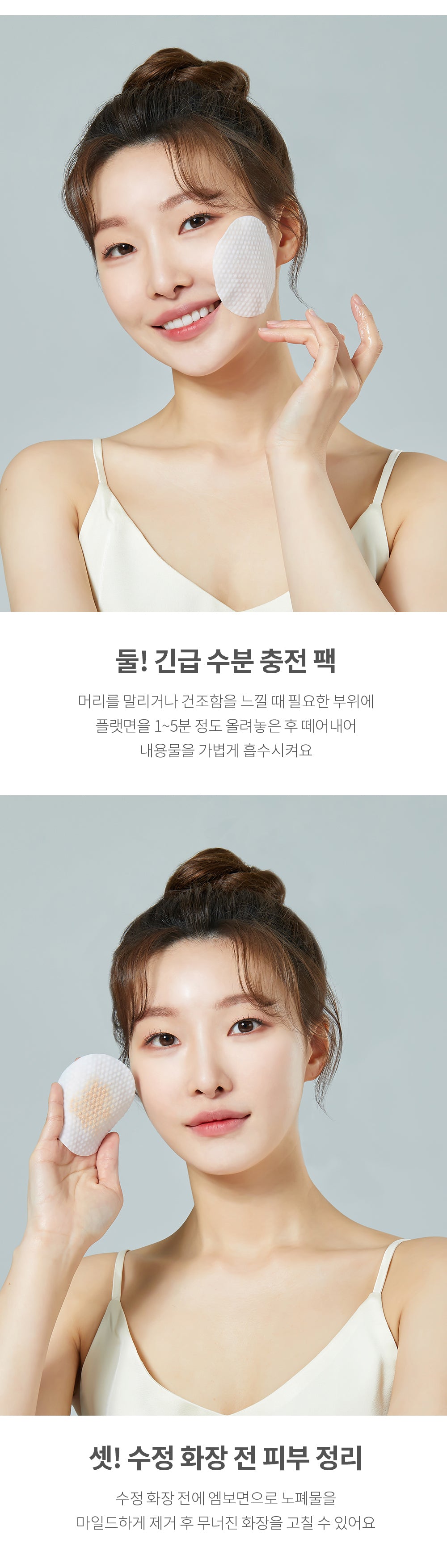 - Use the embossed side to remove impurities and refresh the skin before reapplying makeup.