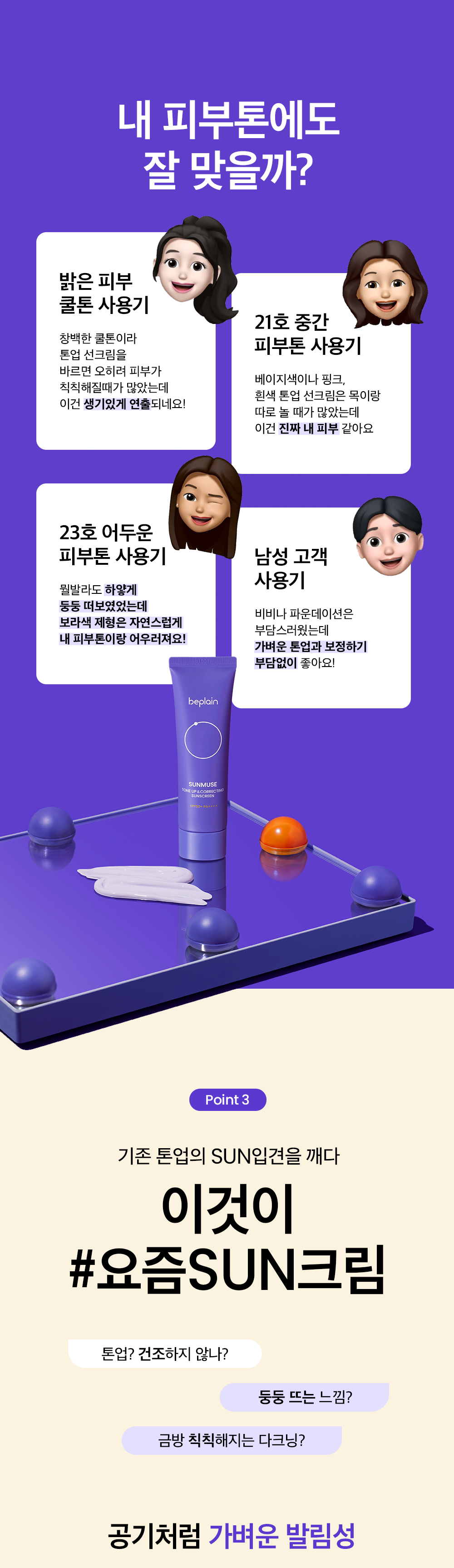 With years of trying to brighten my uneven skin tone, I finally found relief in beplain’s Sunmuse. Its purple hue blends seamlessly and combats dullness without heaviness— a refreshing departure from the past! My daily outings no longer come with concerns about fading hues or unattractive dark patches under harsh sunlight.