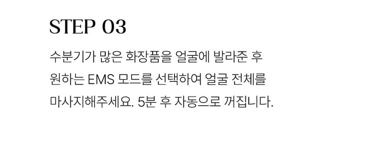 - Reapply your skincare and select the preferred EMS mode to massage the entire face. The device turns off automatically after 5 minutes.