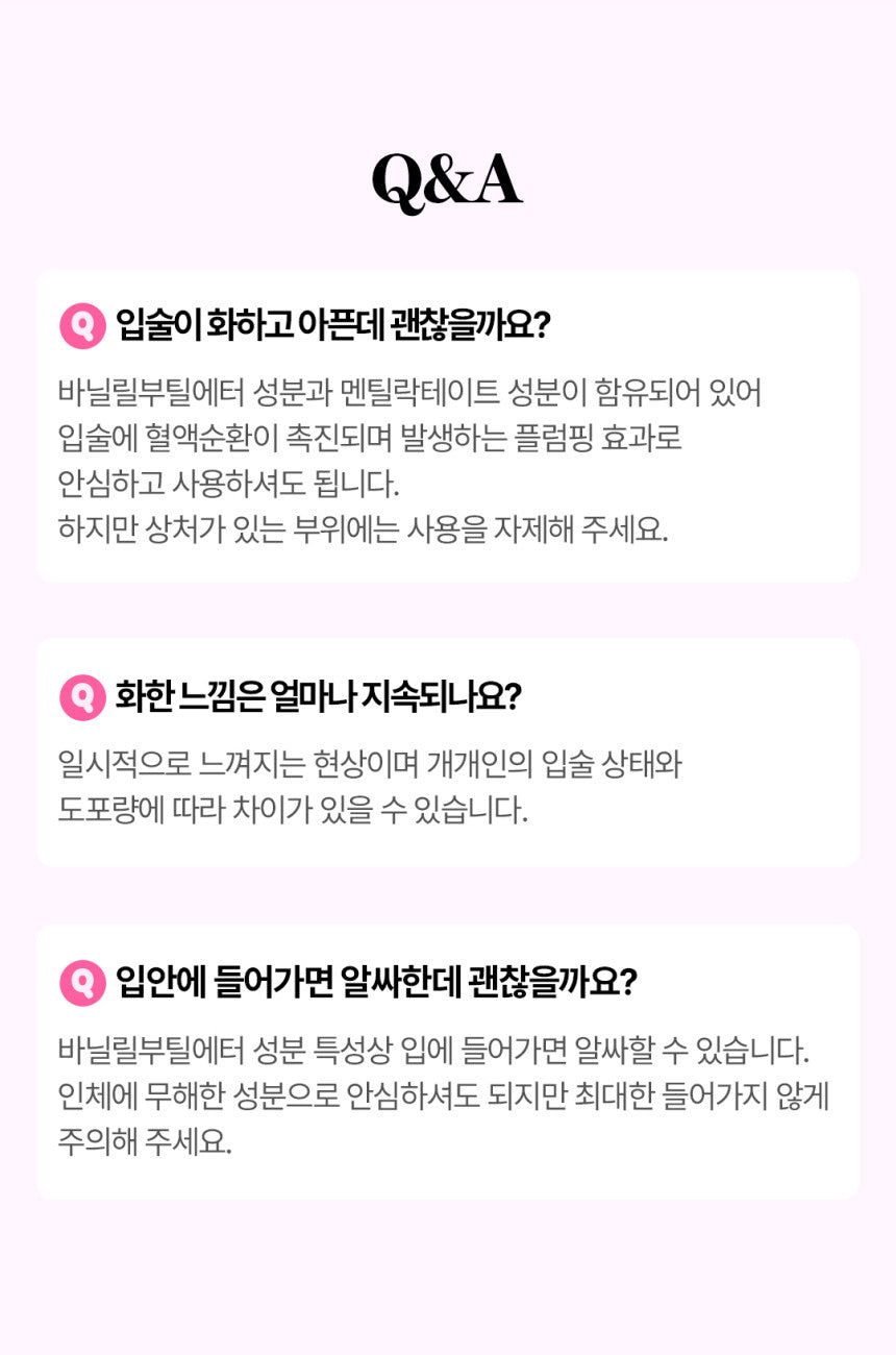 - Heating Sensation: Powered by vanilla butyl ether, it warms the lips, enhancing blood flow and volume.