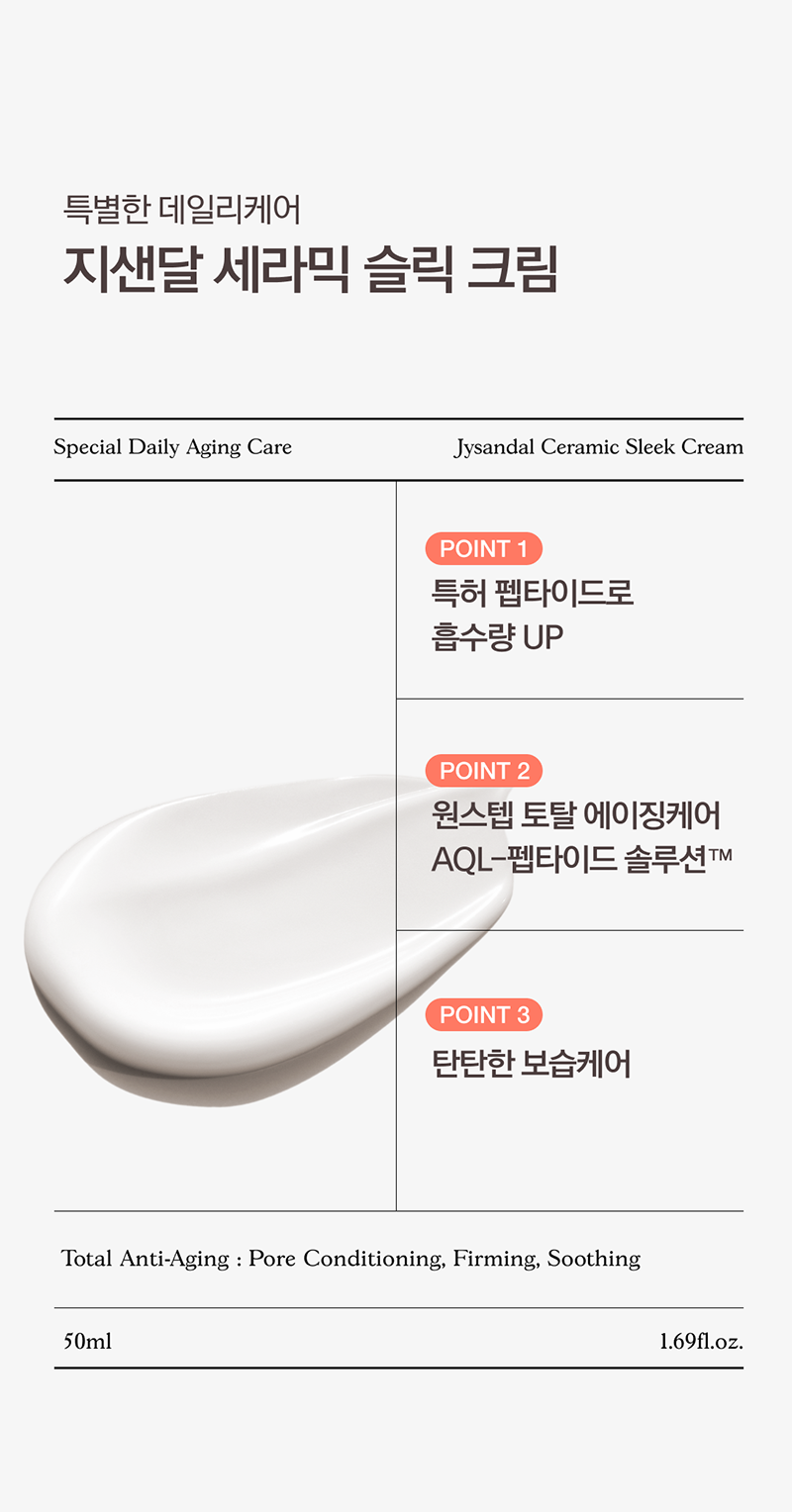 Jysandal Ceramic Sleek Cream is a revolutionary skincare solution designed to tackle both aging signs and hydration concerns. Formulated with AQL-Peptide Solution™, this cream restores balance to skin affected by time and environmental stressors, helping you achieve a youthful, radiant complexion.