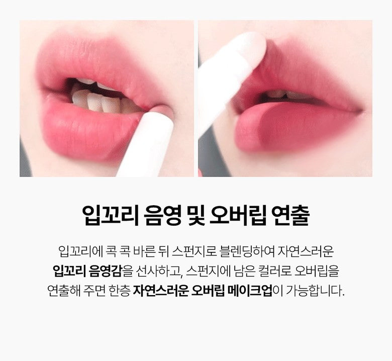 - Create Shading and Overlip Effect: Apply the color stick to the corners of your mouth, then blend with the sponge tip to create a soft, shaded effect. Use the remaining color on the sponge to lightly blend over your lips, achieving a natural, fuller-lip appearance.