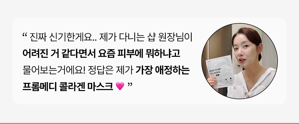 私はこれまでたくさんのコラーゲンマスクを試しましたが、このfrommedi Nano Step Collagen Maskは、間違いなくその中で最高です!見え方や感触がまったく異なり、それにプラスして本当に変革的な結果も得られました。肌が生き返る感じになっていて、自分でも驚いています。一晩だけであんなにもっちりした感じと目元の皺が大幅に改善されたので、友達からもどこで購入したか聞かれること請け合いです。この商品の効果を強調するために再度使うつもりですが、一回限りじゃ満足できないくらいですね。