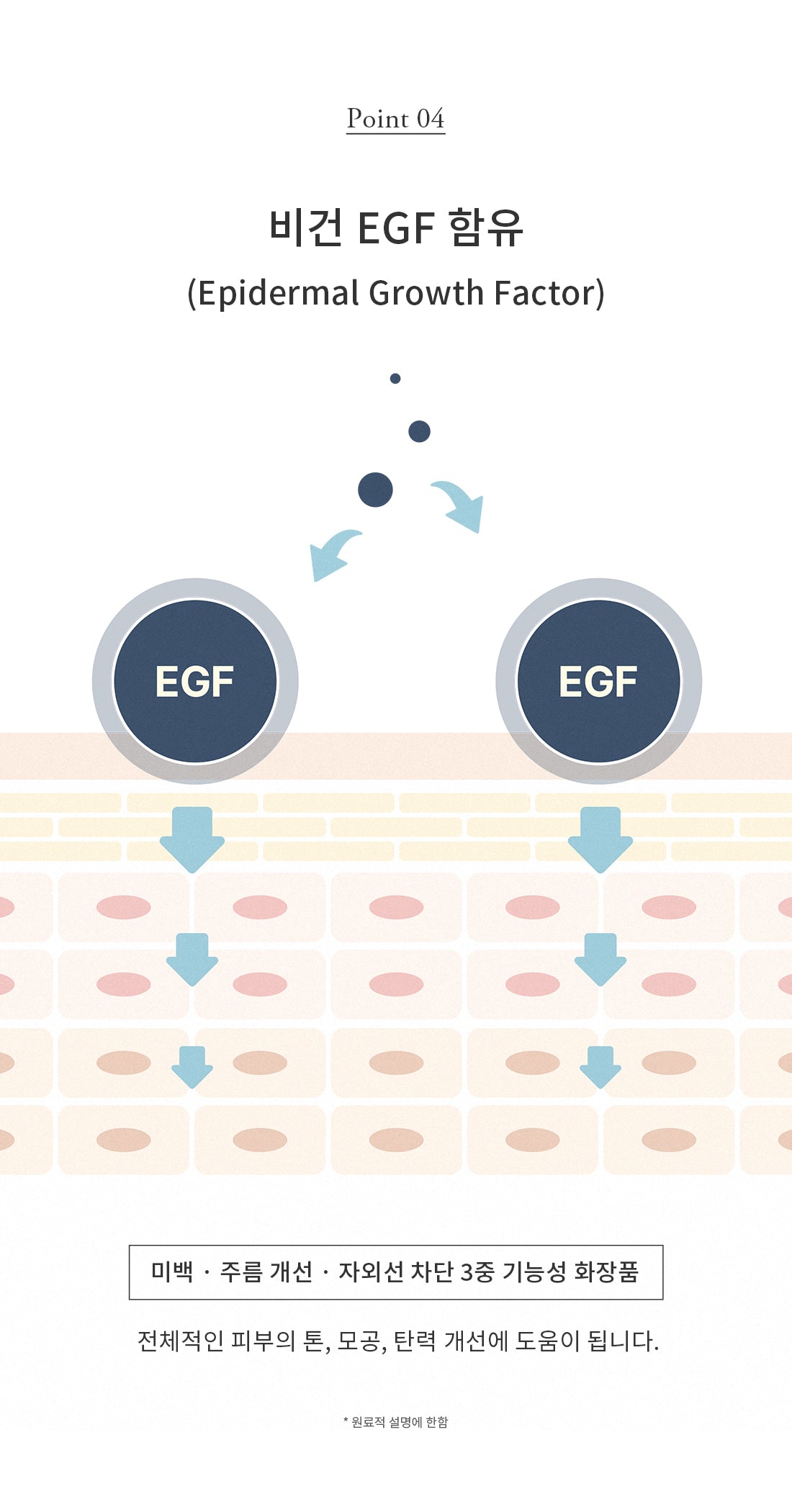 This triple-functional cosmetic product is infused with Vegan EGF, which supports skin whitening, wrinkle improvement, and UV protection. It helps enhance your overall skin tone, pore appearance, and elasticity.