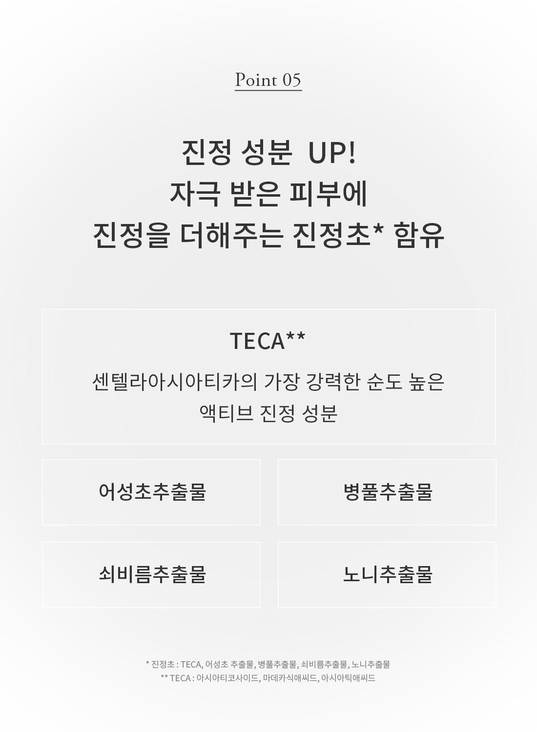 The formula includes soothing herbal extracts that calm irritated skin. Key ingredients like TECA (a potent soothing component of Centella Asiatica), Eoseongcho extract, Centella Asiatica extract, Plantago Asiatica extract, and Noni extract work together to soothe and repair the skin.
