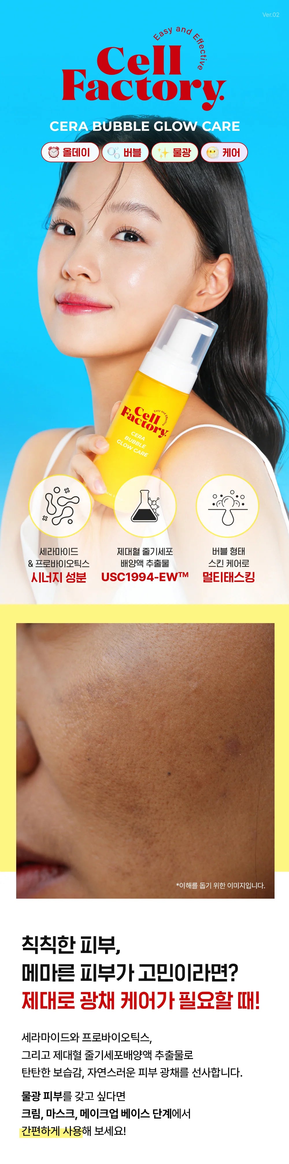 Introducing the ultimate solution for achieving radiant, moisturized, and porcelain-like skin—Cell Factory’s Cera Bubble Glow Care. This innovative product combines the power of ceramides, probiotics, and a unique bubble formula to deliver unparalleled glow care for those struggling with dullness and lack of hydration. Ideal for use at various stages of your skincare routine, including as a cream, mask, and makeup base, it simplifies achieving a luminous complexion.