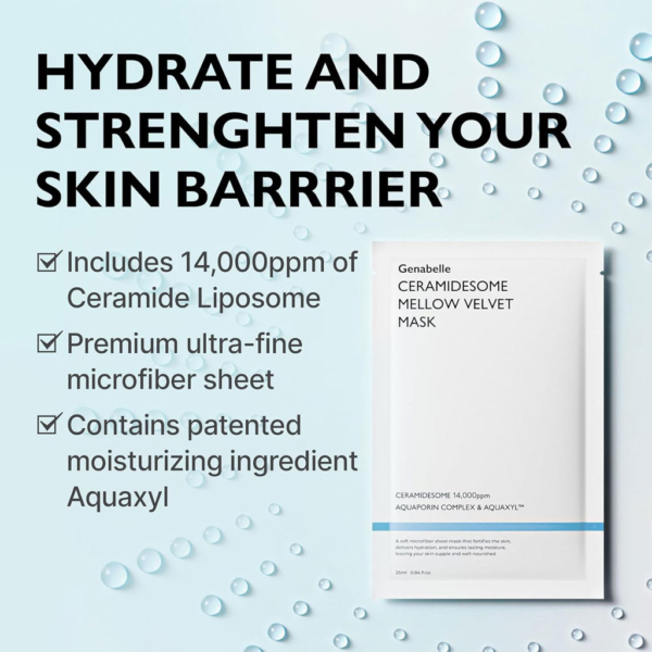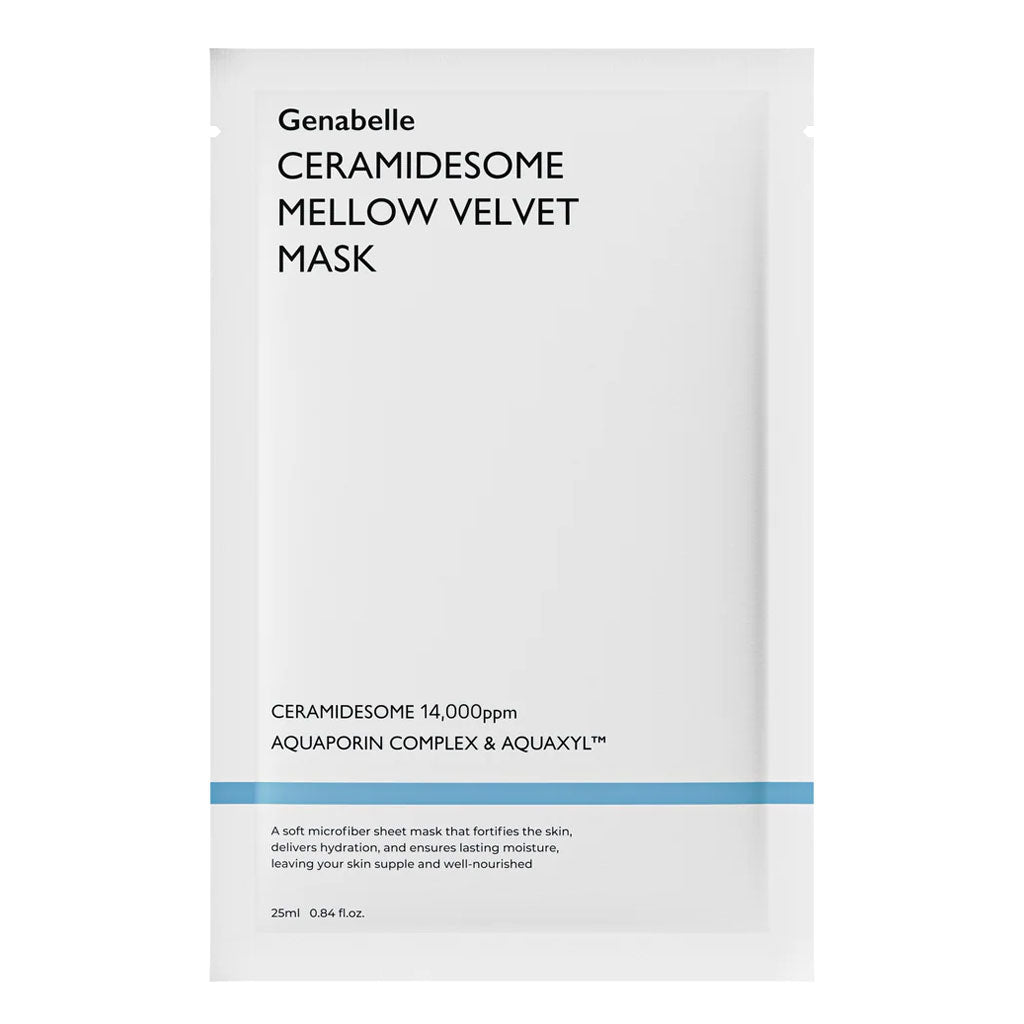 The Genabelle Ceramidesome Mellow Velvet Mask intensely hydrates and fortifies the skin’s natural barrier, reducing dryness and keeping your skin soft and plump. Enriched with Ceramide Liposome to deliver deep hydration and enhance overall skin barrier, while PDRN improves overall skin brightness, plumpness and elasticity. Features Aquaporin Complex to create moisture pathways and hydrate dry areas, while Aquaxyl™ supports hydration and moisture retention. Crafted with a plush, breathable mask material that fits comfortably on the face, ensuring efficient absorption of active ingredients for maximum benefits.