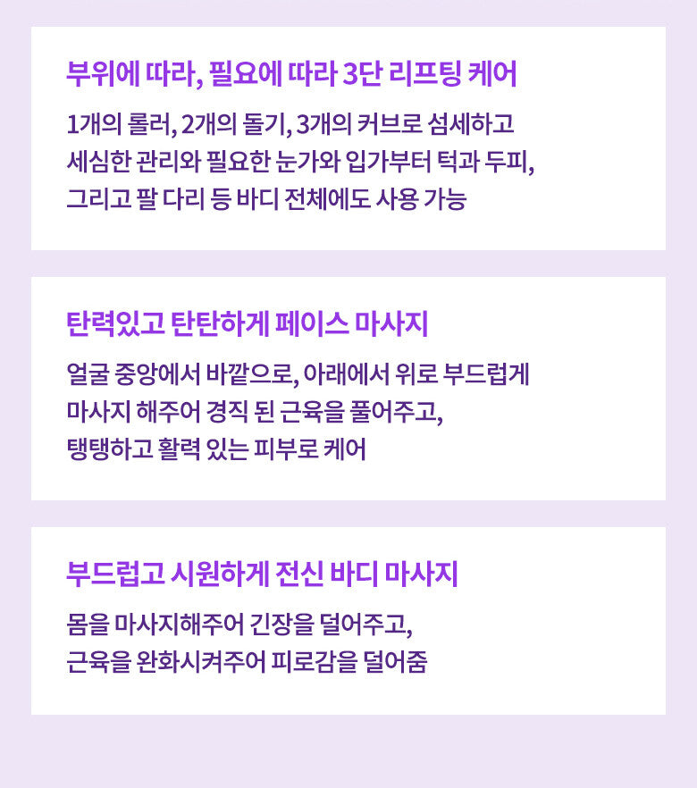 With 1 roller, 2 protrusions and 3 curves, it can be used on the entire body, from the eye area and mouth area to the chin and scalp, and arms and legs required for delicate and meticulous care.Elastic and firm face massage