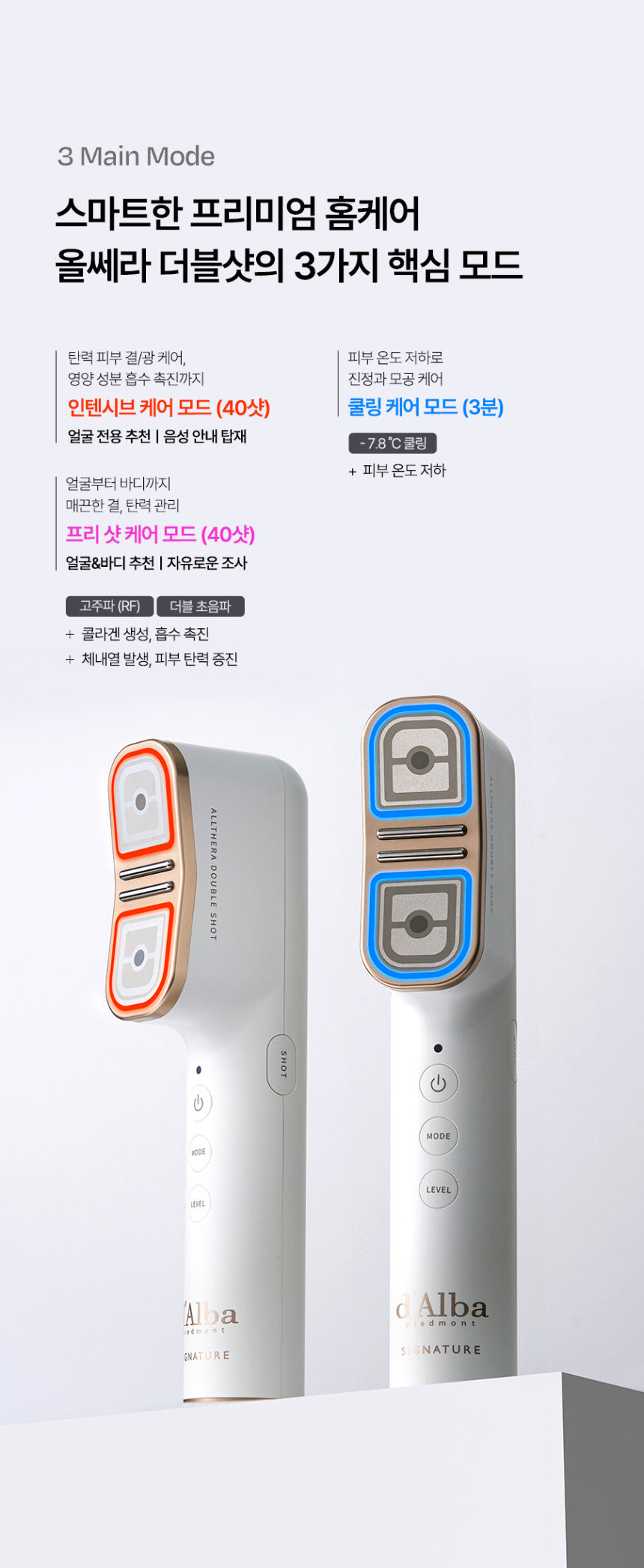 A. You can use the Intensive Care Mode/Free Shot Care Mode with high frequency + double ultrasound effects, followed by the Cooling Care Mode. High frequency and ultrasound generate deep heat in the body, which helps collagen production, and the Cooling Care Mode soothes excessive heat remaining on the outer skin wall, so the two reach different skin layers, so they can be used consecutively.