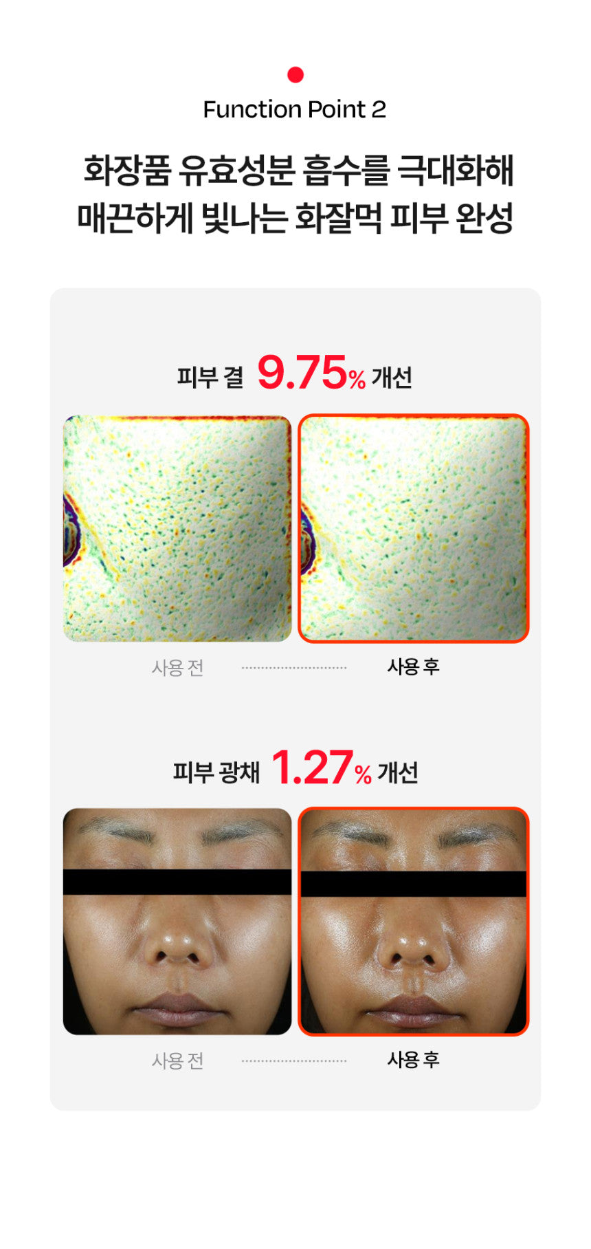 Promotes collagen synthesis, lifting the facial contours while maximizing cosmetic ingredient absorption for glowing, smooth skin. Clinical results demonstrate significant improvements: