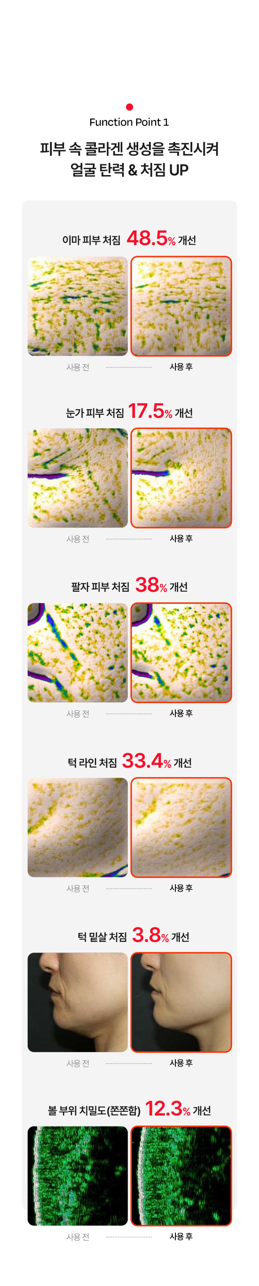 Promotes collagen synthesis, lifting the facial contours while maximizing cosmetic ingredient absorption for glowing, smooth skin. Clinical results demonstrate significant improvements: