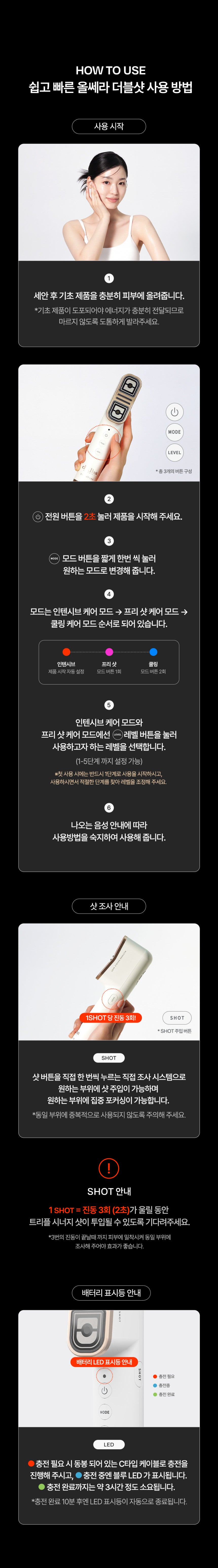 A. You can use the Intensive Care Mode/Free Shot Care Mode with high frequency + double ultrasound effects, followed by the Cooling Care Mode. High frequency and ultrasound generate deep heat in the body, which helps collagen production, and the Cooling Care Mode soothes excessive heat remaining on the outer skin wall, so the two reach different skin layers, so they can be used consecutively.