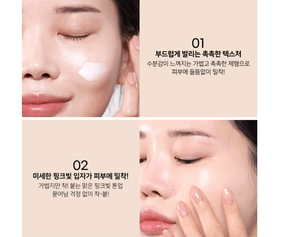 The light yet clear pink tone-up effect brightens the skin instantly while ensuring a natural, long-lasting adherence without smudging.